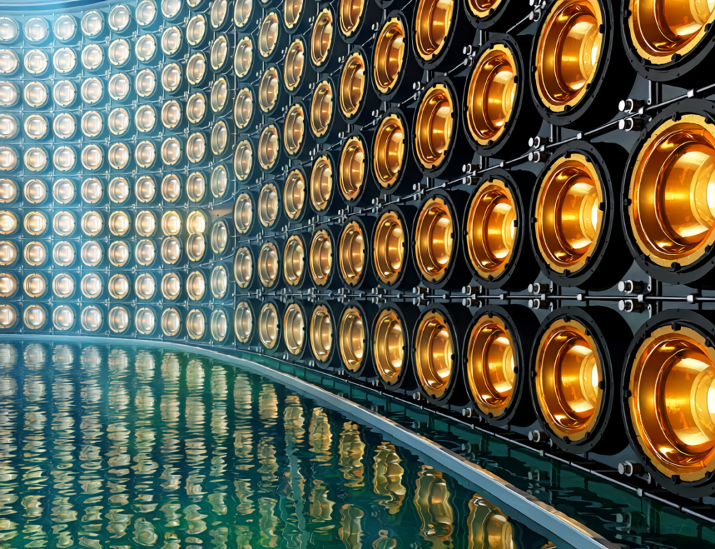 スーパーカミオカンデは、素粒子の一つであるニュートリノを観測するための施設であり、主に大容量の水で満たされた水槽と光電子倍増管で構成されます。ただし、厳密にはニュートリノそのものを観測しているのではなく、ニュートリノと荷電粒子が反応した際に発生するチェレンコフ光を光電子倍増管で検出しています。